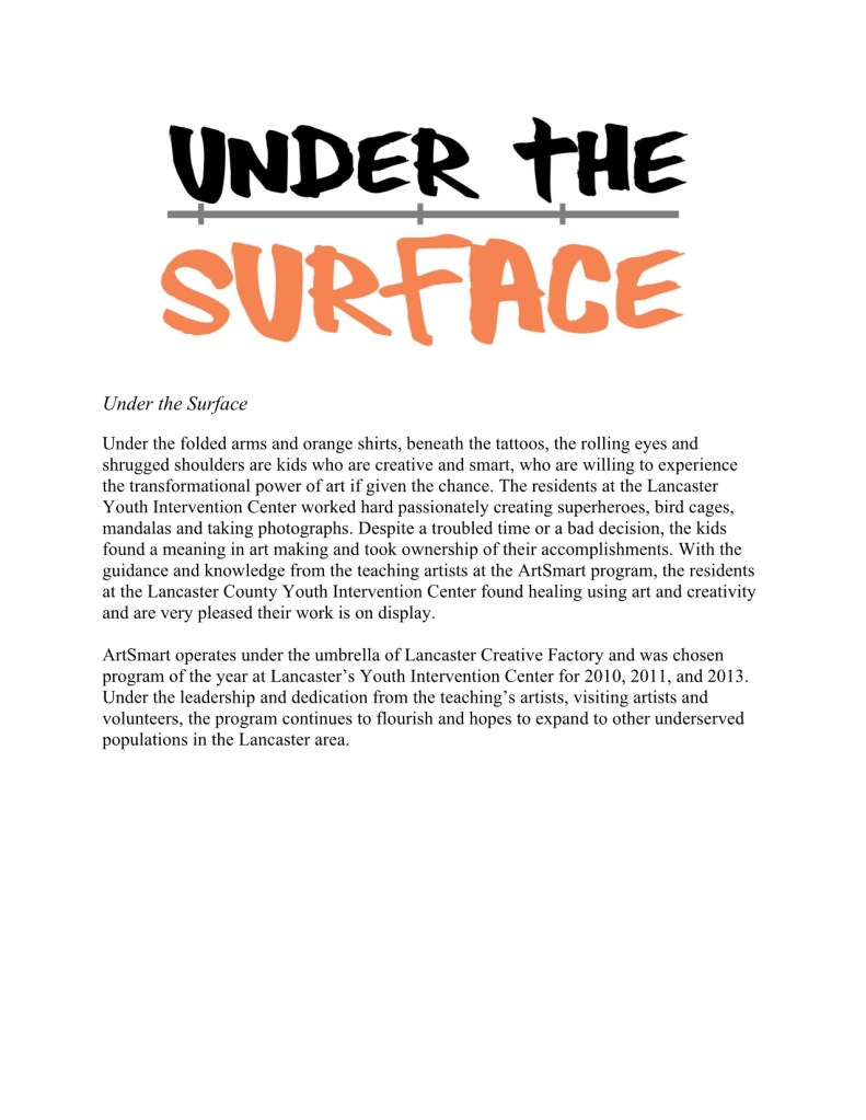 Under the Surface Under the Surface A collective of multidisciplinary works from the residents at the Lancaster County Youth Intervention Center Share this: Share on LinkedIn (Opens in new window) LinkedIn Like Loading...